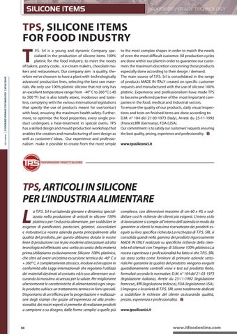 a T.P.S. Srl è un’azienda giovane e dinamica specializzata nella produzione di articoli in silicone 100% platinico per l’industria alimentare, per soddisfare le esigenze di panificatori, pasticcieri, gelatieri, cioccolatieri e ristoratori.La nostra azienda punta principalmente alla qualità del prodotto, per questo abbiamo dotato le nostre linee di produzione con le più moderne attrezzature ad alta tecnologia ed effettuato una scelta accurata della materia prima.Utilizziamo esclusivamente Silicone 100% platinico, che oltre ad avere un’ottima escursione termica da -40° C a + 260° C, è completamente atossico, inodore ed insapore in conformità alle Leggi internazionali che regolano l’utilizzo dei materiali destinati al contatto ed/o uso alimentare assicurando la massima sicurezza per la salute. Per migliorarne ulteriormente le caratteristiche di alimentarietà ogni singolo prodotto subisce un trattamento termico in forni speciali. Disponiamo di un’officina per la progettazione e realizzazione degli stampi che grazie all’esperienza ed alla professionalità dei nostri esperti ci permette di realizzare prodotti a campione o su disegno, dalle forme semplici a quelle più