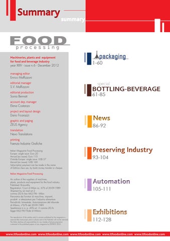 Machineries, plants and equipment for food and beverage industry year XXIV - issue n.6 - December 2012 managing editor Enrico Maffizzoni e ditorial manager S.V. Maffizzoni editorial production Sonia Bennati