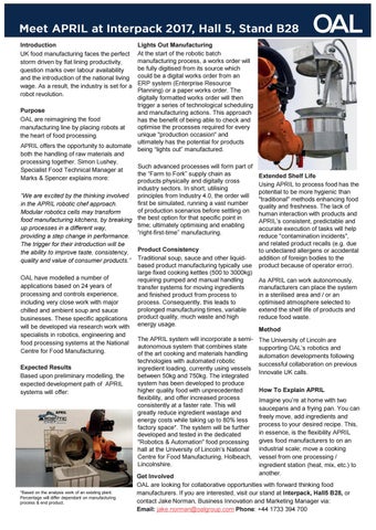 Such advanced processes will form part of the “Farm to Fork” supply chain as products physically and digitally cross industry sectors. In short; utilising “We are excited by the thinking involved principles from Industry 4.0, the order will first be simulated, running a vast number in the APRIL robotic chef approach. of production scenarios before settling on Modular robotics cells may transform food manufacturing kitchens, by breaking the best option for that specific point in time; ultimately optimising and enabling up processes in a different way, “right-first-time” manufacturing. providing a step change in performance. The trigger for their introduction will be the ability to improve taste, consistency, Product Consistency quality and value of consumer products.” Traditional soup, sauce and other liquidbased product manufacturing typically use large fixed cooking kettles (500 to 3000kg) OAL have modelled a number of requiring pumped and manual handling applications based on 24 years of transfer systems for moving ingredients processing and controls experience, and finished product from process to process. Consequently, this leads to including very close work with major prolonged manufacturing times, variable chilled and ambient soup and sauce product quality, much waste and high businesses. These specific applications will be developed via research work with energy usage. specialists in robotics, engineering and The APRIL system will incorporate a semifood processing systems at the National autonomous system that combines state Centre for Food Manufacturing. of the art cooking and materials handling Expected Results Based upon preliminary modelling, the expected development path of APRIL systems will offer: