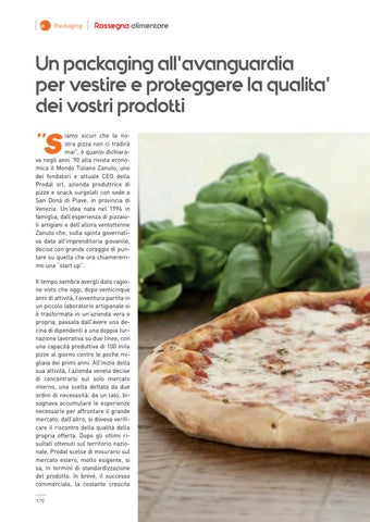 iamo sicuri che la nostra pizza non ci tradirà mai”, è quanto dichiarava negli anni ’90 alla rivista economica il Mondo Tiziano Zanuto, uno dei fondatori e attuale CEO della Prodal srl, azienda produttrice di pizze e snack surgelati con sede a San Donà di Piave, in provincia di Venezia. Un’idea nata nel 1994 in famiglia, dall’esperienza di pizzaioli artigiani e dell’allora ventottenne Zanuto che, sulla spinta governativa data all’imprenditoria giovanile, decise con grande coraggio di puntare su quella che ora chiameremmo una “start up”. Il tempo sembra avergli dato ragione visto che oggi, dopo venticinque anni di attività, l’avventura partita in un piccolo laboratorio artigianale si è trasformata in un’azienda vera e propria, passata dall’avere una decina di dipendenti a una doppia turnazione lavorativa su due linee, con una capacità produttiva di 100 mila pizze al giorno contro le poche migliaia dei primi anni. All’inizio della sua attività, l’azienda veneta decise di concentrarsi sul solo mercato interno, una scelta dettata da due ordini di necesssità: da un lato, bisognava accumulare le esperienze necessarie per affrontare il grande mercato; dall’altro, si doveva verificare il riscontro della qualità della propria offerta. Dopo gli ottimi risultati ottenuti sul territorio nazionale, Prodal scelse di misurarsi sul mercato estero, molto esigente, si sa, in termini di standardizzazione del prodotto. In breve, il successo commerciale, la costante crescita 170