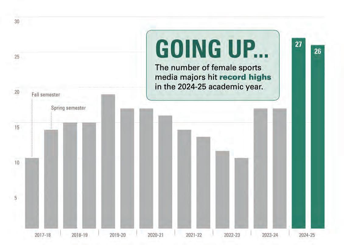 Data collected by the Officeof Analytics and Institutional Research highlights a gap between the proportion of female students in sport majors and the college. The Spring 2025 undergraduate student body 57% female students, with the Roy H. Park School of Communications and School of Business coming in at 51% and 27.4% female students, respectively. Of the total female students enrolled in the college, 5.2% are in the business school and 26.5% are in the communications school. Only 0.7% of students who are female major or have a concentration in sport management, while 1% major in sports media.