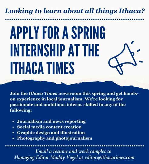 s C ott M anson , a ssociat E p ublish E r F r EE lanc E rs : Barbara Adams, G. M Burns, Charley Githler, Stephen Burke, Bill Chaisson, Ross Haarstad, Steve Lawrence, Marjorie Olds, Henry Stark, Peter Rothbart, Austin Lamb, Clement Obropta, Jake Sexton, Kira Walter, and Vasant Alex Laplam THE ENTIRE CONTENTS OF THE ITHACA TIMES ARE COPYRIGHT © 2025 BY PATHWAYS TO EQUITY, LLC. All rights reserved. Events are listed free of charge in TimesTable. All copy must be received by Friday at noon. The Ithaca Times is available free of charge from various locations around Ithaca. Additional copies may be purchased from the Ithaca Times offices for $1. SUBSCRIPTIONS: $139 one year. Include check or money order and mail to the Ithaca Times, PO Box 27, Ithaca, NY 14851. ADVERTISING: Deadlines are Monday 5 p.m. for display, Tuesday at noon for classified. Advertisers should check their ad on publication. The Ithaca Times will not be liable for failure to publish an ad, for typographical error, or errors in publication except to the extent of the cost of the space in which the actual error appeared in the first insertion. The publisher reserves the right to refuse advertising for any reason and to alter advertising copy or graphics deemed unacceptable for publication. The Ithaca Times is published weekly Wednesday mornings. Offices are located at 109 N. Cayuga Street, Ithaca, NY 14850 607-277-7000, FAX 607277-1012, MAILING ADDRESS is PO Box 27, Ithaca, NY 14851. The Ithaca Times was preceded by the Ithaca New Times (1972–1978) and The Good Times Gazette (1973–1978), combined in 1978. FoundEr good t MEs gazEttE: