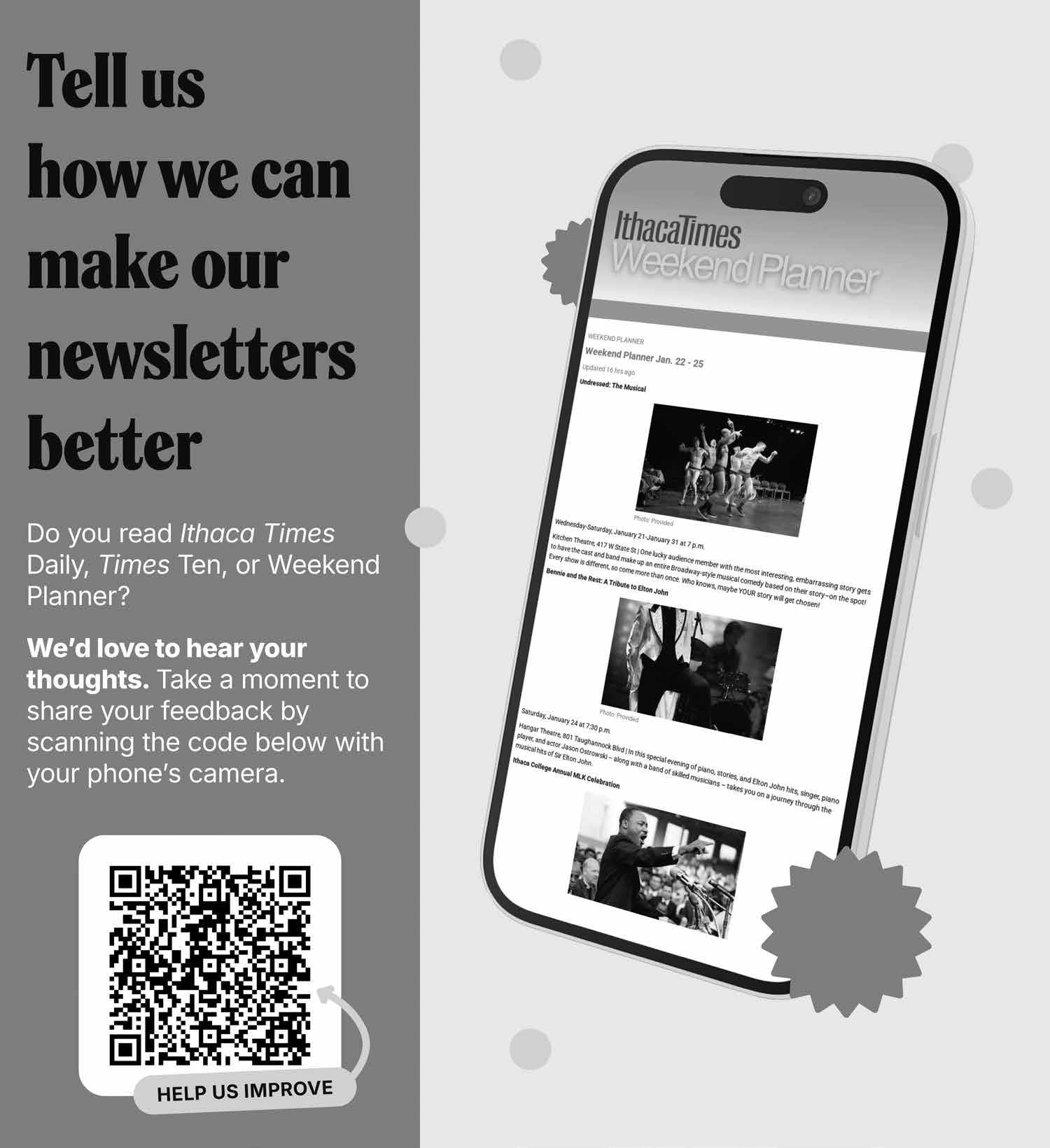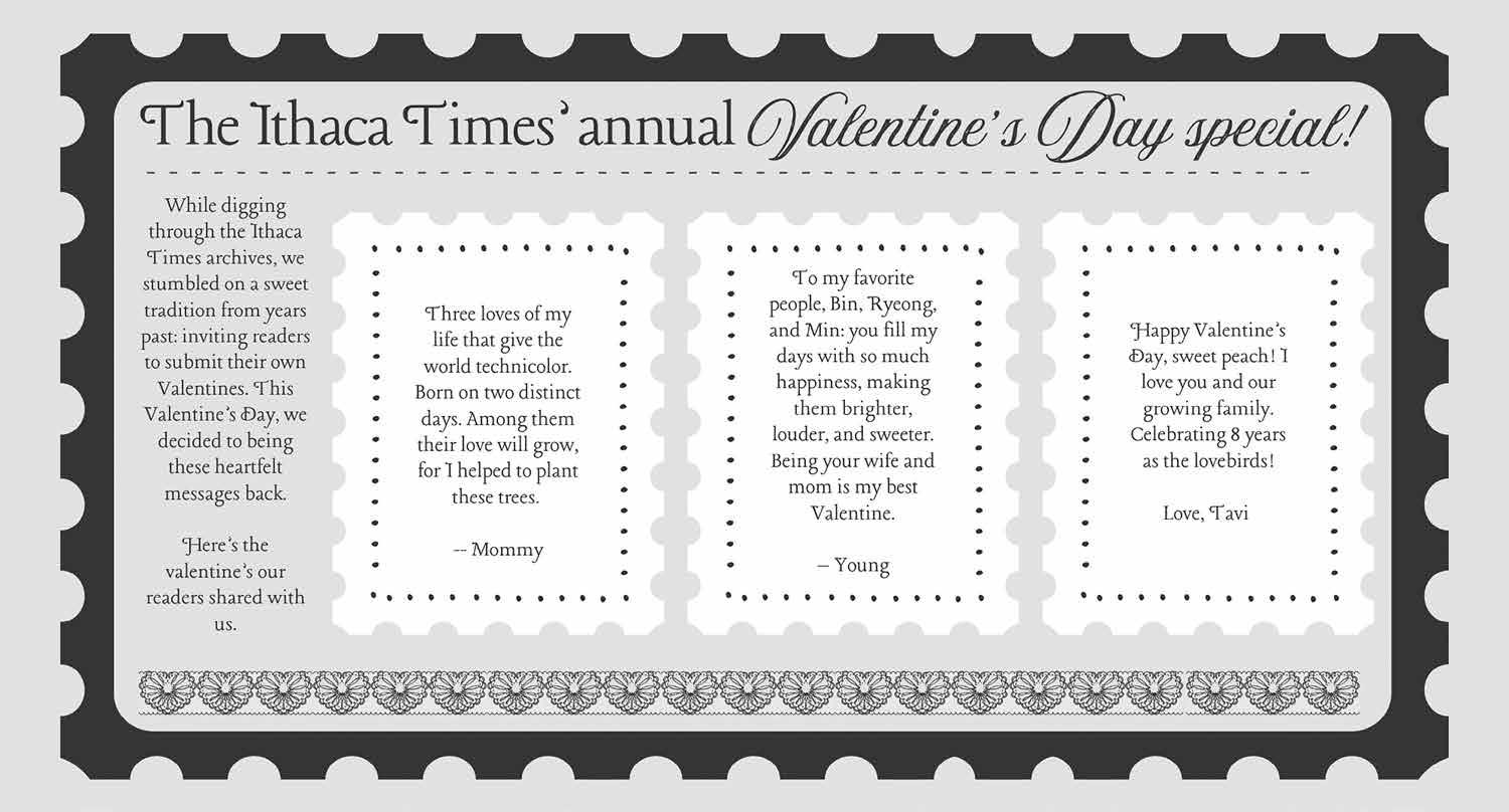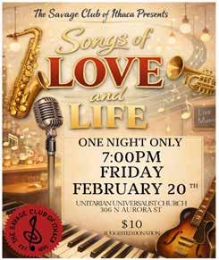THE ENTIRE CONTENTS OF THE ITHACA TIMES ARE COPYRIGHT © 2026 BY PATHWAYS TO EQUITY, LLC. All rights reserved. Events are listed free of charge in TimesTable. All copy must be received by Friday at noon. The Ithaca Times is available free of charge from various locations around Ithaca. Additional copies may be purchased from the Ithaca Times offices for $1. SUBSCRIPTIONS: $139 one year. Include check or money order and mail to the Ithaca Times, PO Box 27, Ithaca, NY 14851. ADVERTISING: Deadlines are Monday 5 p.m. for display, Tuesday at noon for classified. Advertisers should check their ad on publication. The Ithaca Times will not be liable for failure to publish an ad, for typographical error, or errors in publication except to the extent of the cost of the space in which the actual error appeared in the first insertion. The publisher reserves the right to refuse advertising for any reason and to alter advertising copy or graphics deemed unacceptable for publication. The Ithaca Times is published weekly Wednesday mornings. Offices are located at 109 N. Cayuga Street, Ithaca, NY 14850 607-277-7000, FAX 607277-1012, MAILING ADDRESS is PO Box 27, Ithaca, NY 14851. The Ithaca
