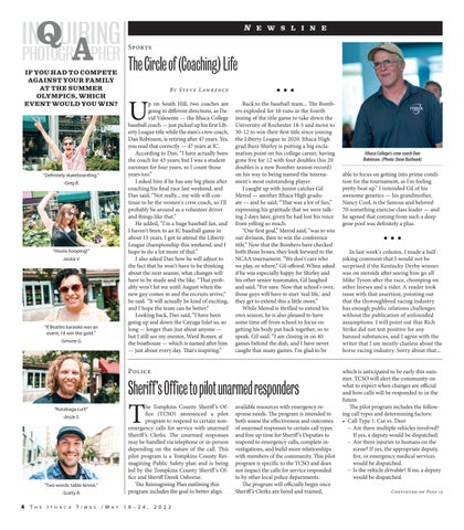 In last week's column, I made a halfjoking comment that I would not be surprised if the Kentucky Derby winner was on steroids after seeing him go all Mike Tyson after the race, chomping on other horses and a rider. A reader took issue with that assertion, pointing out that the thoroughbred racing industry has enough public relations challenges without the publication of unfounded assumptions. I will point out that Rich Strike did not test positive for any banned substances, and I agree with the writer that I am mostly clueless about the horse racing industry. Sorry about that... which is anticipated to be early this summer. TCSO will alert the community on what to expect when changes are official and how calls will be responded to in the future. The pilot program includes the following call types and determining factors: • Call Type 1: Car vs. Deer − Are there multiple vehicles involved? If yes, a deputy would be dispatched. − Are there injuries to humans on the scene? If yes, the appropriate deputy, fire, or emergency medical services would be dispatched. − Is the vehicle drivable? If no, a deputy would be dispatched. Contin u ed on Page 15