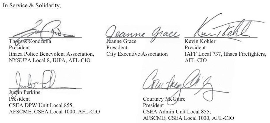 The City of Ithaca has reached a crossroads. There are widespread vacancies across all city departments which have led to mandatory overtime, costly contracting out of services, and incredibly low morale among all city workers. Notably, the Department of Public Works alone is down 30 posi tions and Ithaca Police Department staffing is down almost 30% over the past decade, all while our community continues to grow and the demand for public services increases. We take great pride in our work however we continue to be treated as a liability, dispensable and easily replaceable by City Hall.