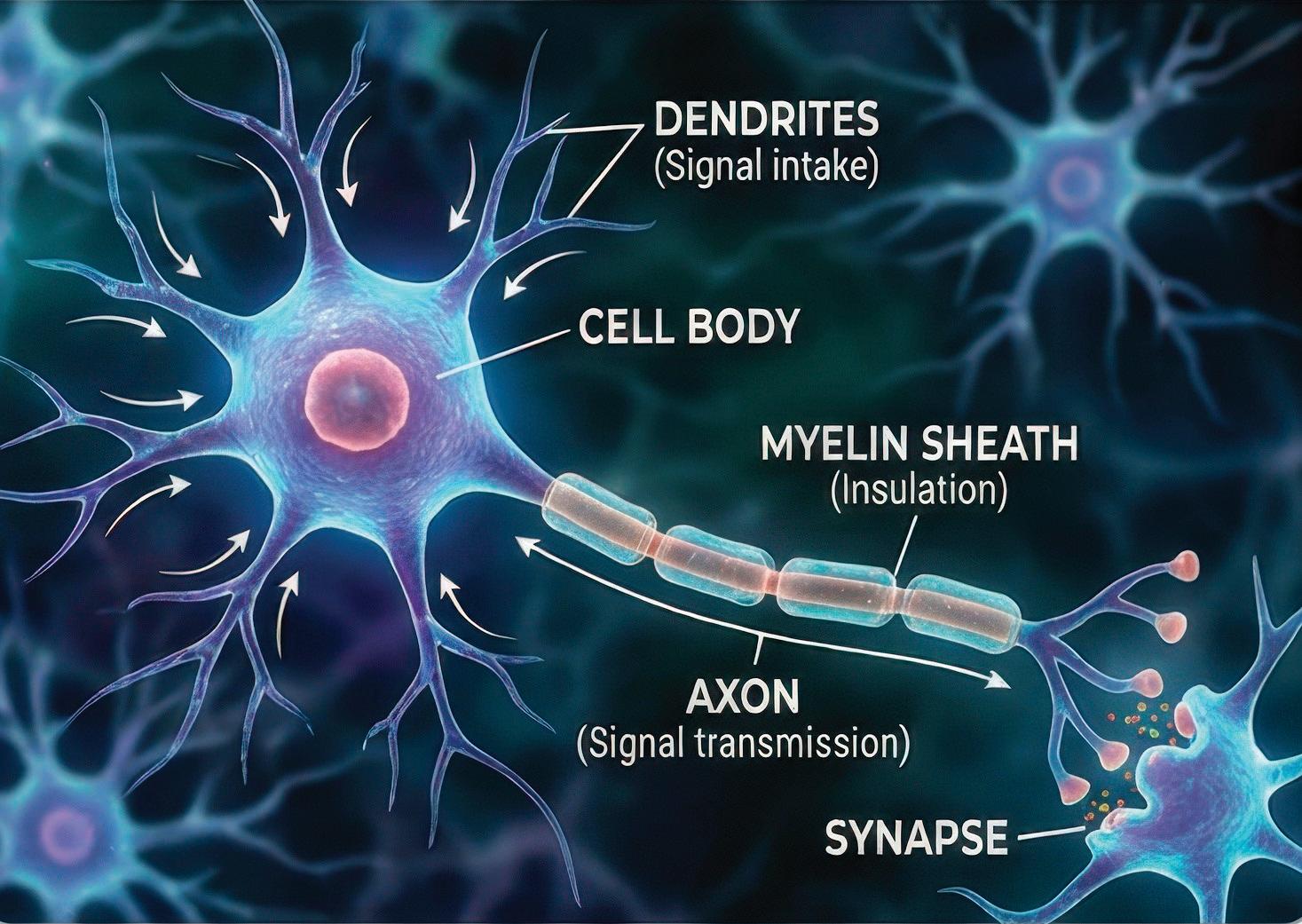 Illustration of the parts of a neuron. Structural changes in neurons are associated with learning and potentially with the therapeutic effects of psychedelic compounds such as psilocybin and ibogaine. (Illustration: Charming Studio/stock.adobe.com)