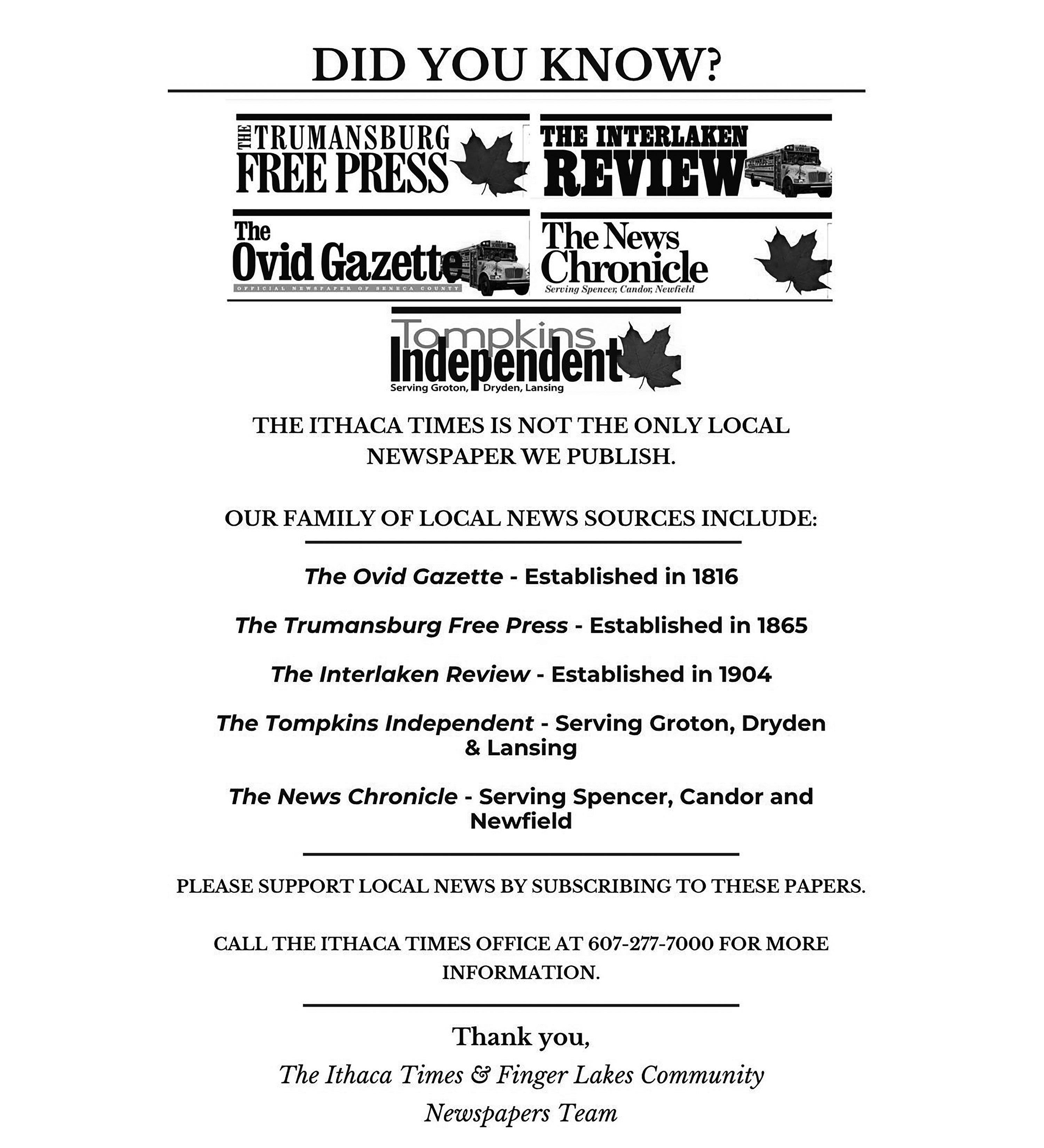 THE ENTIRE CONTENTS OF THE ITHACA TIMES ARE COPYRIGHT © 2026 BY PATHWAYS TO EQUITY, LLC. All rights reserved. Events are listed free of charge in TimesTable. All copy must be received by Friday at noon. The Ithaca Times is available free of charge from various locations around Ithaca. Additional copies may be purchased from the Ithaca Times offices for $1. SUBSCRIPTIONS: $139 one year. Include check or money order and mail to the Ithaca Times, PO Box 27, Ithaca, NY 14851. ADVERTISING: Deadlines are Monday 5 p.m. for display, Tuesday at noon for classified. Advertisers should check their ad on publication. The Ithaca Times will not be liable for failure to publish an ad, for typographical error, or errors in publication except to the extent of the cost of the space in which the actual error appeared in the first insertion. The publisher reserves the right to refuse advertising for any reason and to alter advertising copy or graphics deemed unacceptable for publication. The Ithaca Times is published weekly Wednesday mornings. Offices are located at 109 N. Cayuga Street, Ithaca, NY 14850 607-277-7000, FAX 607277-1012, MAILING ADDRESS is PO