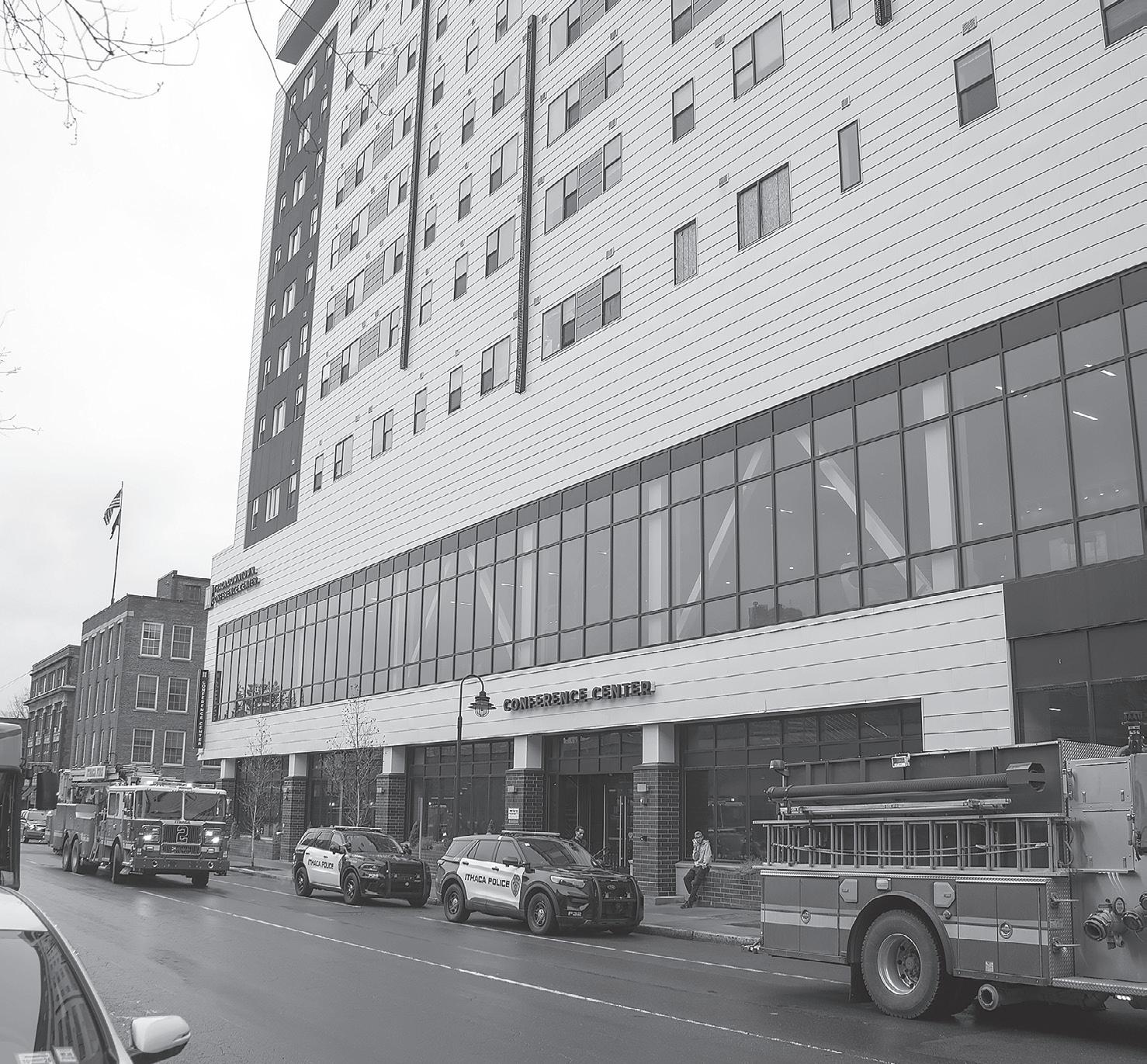 On March 4, the city issued an o cial vacate order for oors four through 11 of the building. Fire ghters responding to a routine alarm discovered broken and missing glass in the stairwells and hallways of Asteri Ithaca, a 12-story downtown affordable housing development. e damage compromised the high-rise’s smoke evacuation system and rendered standard re prevention measures unreliable.
