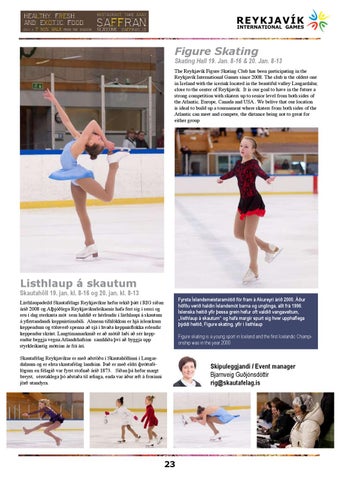 Skating Hall 19. Jan. 8-16 & 20. Jan. 8-13 The Reykjavík Figure Skating Club has been participating in the Reykjavík International Games since 2008. The club is the oldest one in Iceland with the icerink located in the beautiful valley Laugardalur, close to the center of Reykjavík. It is our goal to have in the future a strong competition with skaters up to senior level from both sides of the Atlantic, Europe, Canada and USA . We belive that our location is ideal to build up a tournament where skaters from both sides of the Atlantic can meet and compete, the distance being not to great for either group