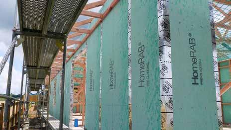 HomeRAB™ Pre-Cladding is a costeffective, 4.5mm thick fibre cement rigid air barrier. For use in residential builds to provide resistance to gusting wind to reduce draughts and identifiable by the green water repellent sealer to keep moisture out.