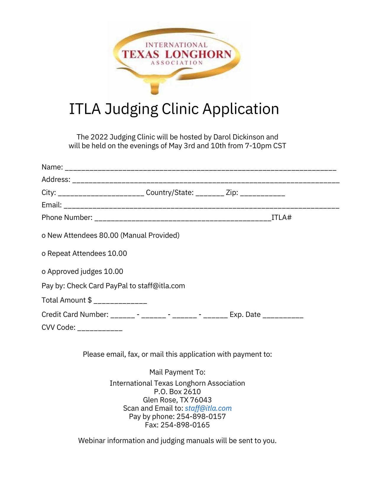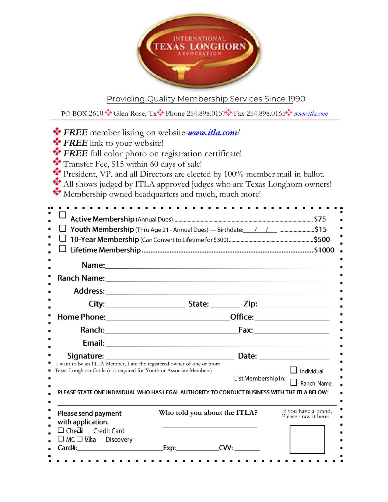 Transfers Regi strati ons Memberships QTY QTY Fee Fee Subtotal Sales Tax Total PO BOX 2610 - GLEN ROSE, TEXAS- 76043 Total Total Date: Member: ITLA# Address: City: State: Zip: Lifetime Member 10 Year Membership Youth Membership Annual Active Member Within