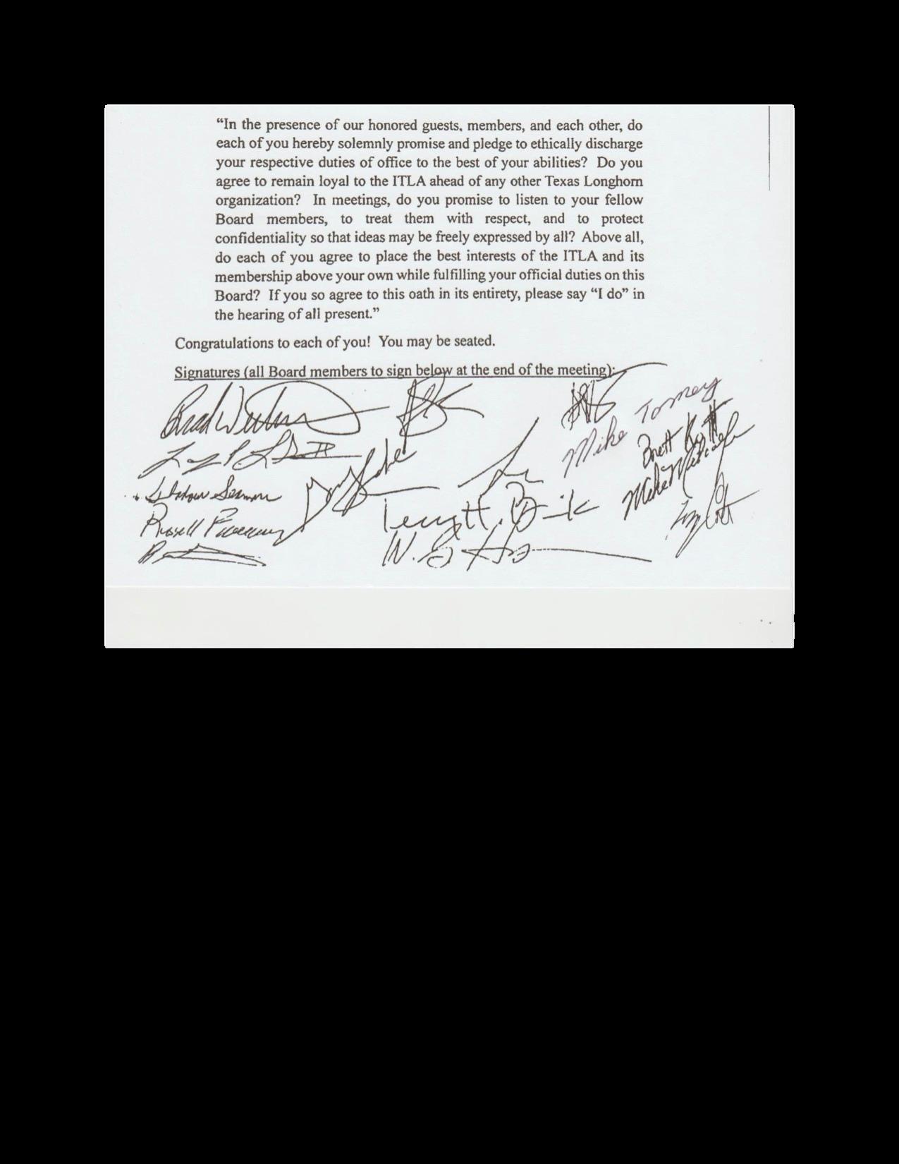 While many of us fondly recall the days when a person’s word was their bond and a handshake was an iron-clad agreement, in modern society oaths are increasingly important The President of the United States must take an oath before starting a new term of office. Contracts often require verification before a notary. And in my other line of work, a court reporter swears-in each witness before I depose or cross-examine them. Oaths bind us to our word; and written oaths allow others to reference back to our promises made and hold us to them. At the fine suggestion of Darol Dickinson, it was decided by President Freeman that our new and current International Board of Directors should take an oath of office as a pledge to each other and our membership to uphold those ideals to which we were each elected For those Board members who were able to attend the Annual Meeting in October, the oath was orally taken upon being read by Stan Searle and was then signed in the presence of all. Our newest two members (Guy Cote and Gary Lake) have subsequently added their own signatures to the Oath. Collectively, the Board wanted to publish that oath here, as a declaration of our commitment to you: the ITLA member. Hold us to it.