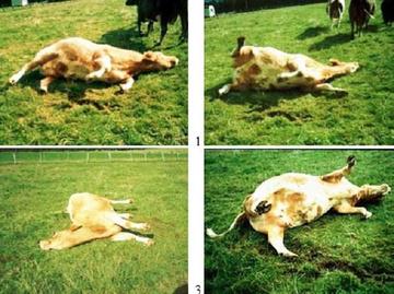 As previously mentioned, in a classic case of grass tetany, the cow is usually found dead and the ground around the carcass if disturbed due to paddling and seizures before death. The interval between the first signs of grass tetany and death may be as few as 4-8 hours. However, if noticed in the beginning stage, the earliest signs are twitching of the ears, facial muscles, shoulder and flank, and a stiff gait. The affected cow will separate from the herd and may show a variety of symptoms which would possibly include aggressive nature, bellowing, galloping and staggering and they may also appear as though they have gone blind.
