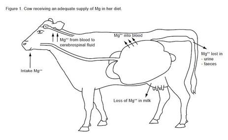 And excess dietary magnesium is processed through the kidneys and expelled via urine. Cattle have no effective reservoir of tissue magnesium so shortage cannot be compensated for by removal from bones or increasing magnesium absorption from other sites on the body. In addition, magnesium is not controlled by horomones to keep it in balance as with other major minerals. A simple lack of magnesium intake in the diet can happen as in cases of starvation or if off feed. Deficiencies are most often due to interference with magnesium absorption in the rumen.