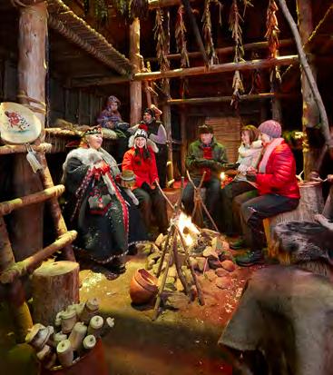 of our boots stomping on the nearly frozen ground, the night is quiet as we make our way from the hotel to the longhouse. It’s a short walk, but I am breathless with anticipation–the upcoming Myths and Legends storytelling session promises to be the highlight of my stay at Hotel-Musée Premières Nations. Situated in Wendake, an urban reserve and village in Quebec City, and home to the Huron-Wendat people, this First Nations-owned property includes 4-star accommodation, the awardwinning Restaurant La Traite, the HuronWendat Museum and the National Longhouse Ekionkestha. The latter is a shortened replica of a traditional dwelling of the Huron-Wendat, pre-contact.
