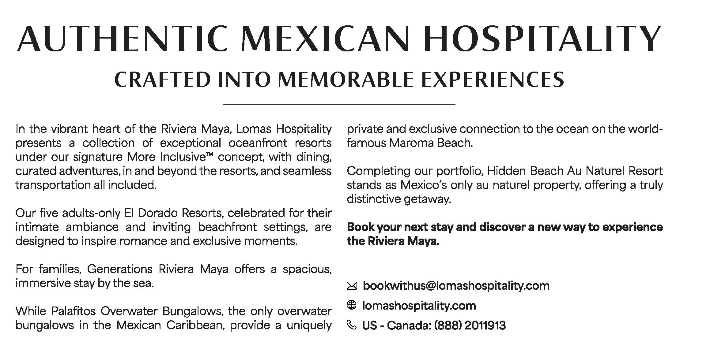 To that end, some of our foodfocused features include one writer’s deep dive into some of the best food and wines on offer in Ontario’s Niagara region, while another story focuses on the many diverse influences that make up the culinary scene in Queensland, Australia. We also have a piece on the many reasons to put Vienna at the top of your must-visit list for the food alone, from traditional spaetzle and apple strudel to modern, Michelin-starred plates. Lucerne’s renowned CAAA restaurant offers a fun fusion of nature, art and culinary science, and we also head to Italy on a food-focused journey into the timehonoured art and taste of Modena’s prized vinegar. Over in Riviera Maya, Fairmont Mayakoba is home to several culinary experiences well worth travelling (and coming back) for.