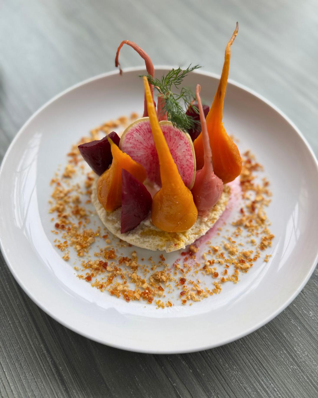 The key to many a great chef-prepared recipe is the quality and seasonality of the ingredients. Here, Niagara-grown heirloom beets show off their fresh earthiness dressed simply with fluffy whipped chèvre, housemade Damson plum jam and a toasty hazelnut vinaigrette.