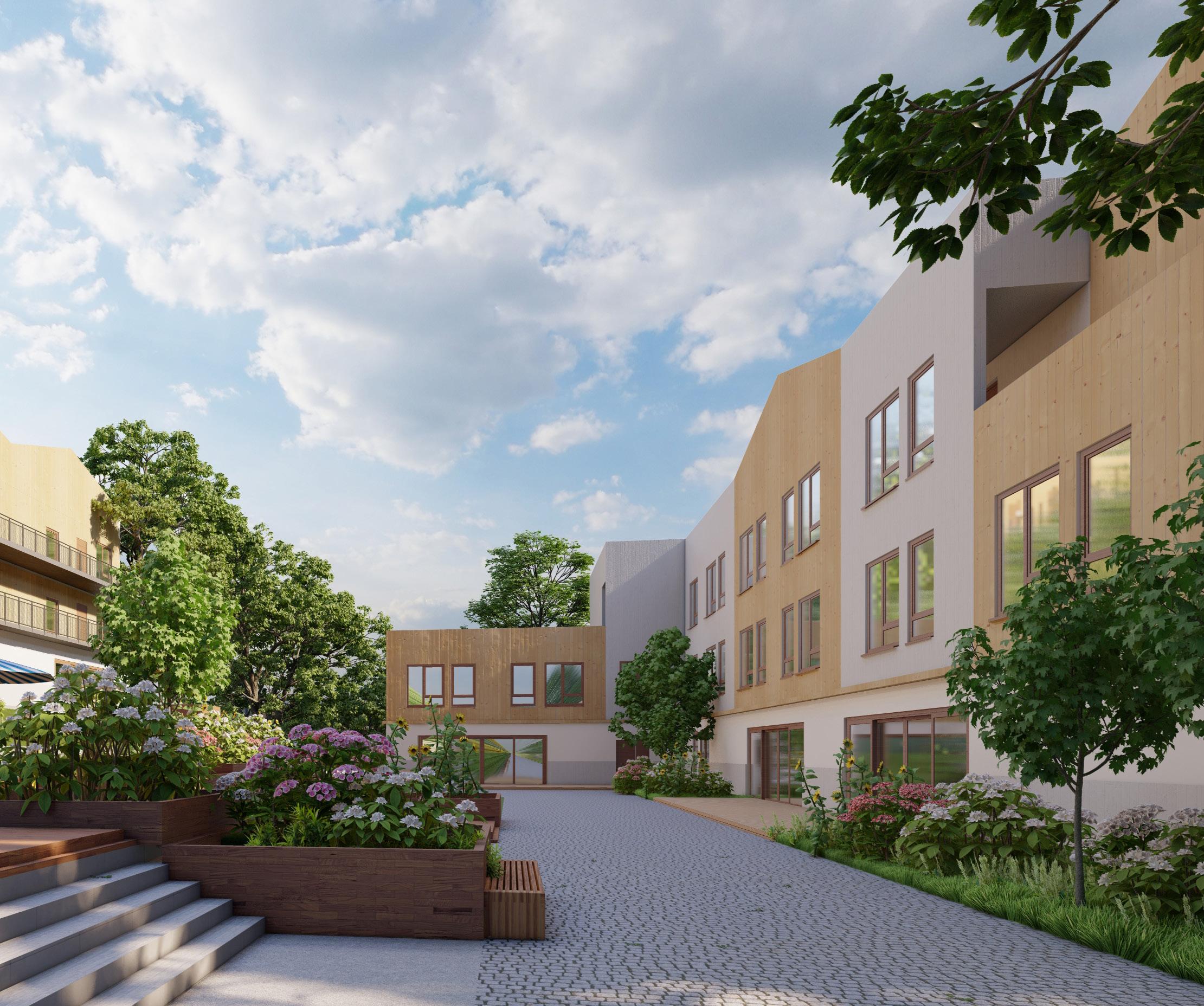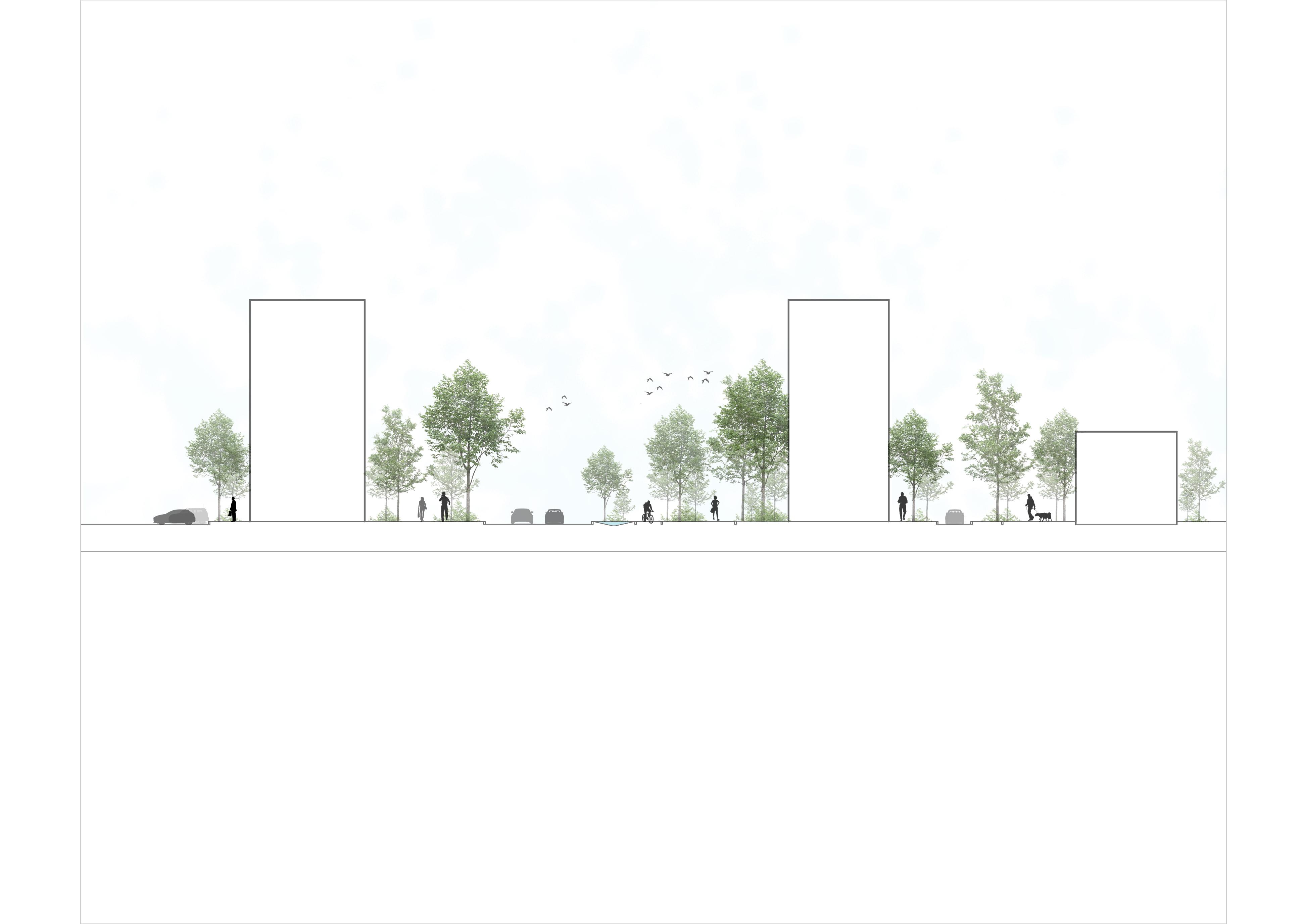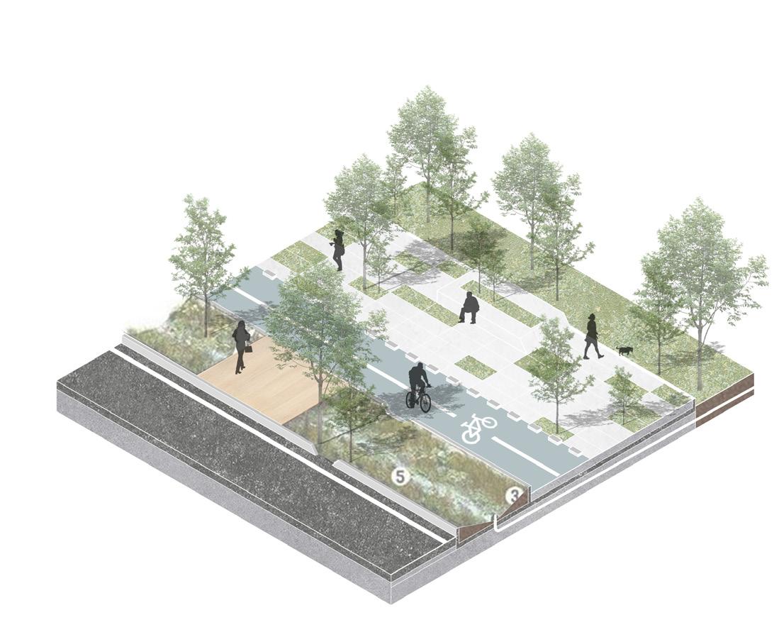 Le projet intègre une réflexion approfondie sur le paysage et le revêtement des sols pour répondre aux enjeux environnementaux et climatiques. L’utilisation de dalles de verdure perméables, telles que les pavés alvéolés, est proposée pour permettre un meilleur écoulement des eaux pluviales vers les égouts. Ces matériaux de couleur claire réduiront également la formation d’îlots de chaleur, contribuant ainsi à un microclimat plus agréable pour les habitants. Cet aménagement ne se limite pas à un simple embellissement paysager : il s’inscrit dans une démarche durable favorisant la résilience du quartier face aux défis climatiques.