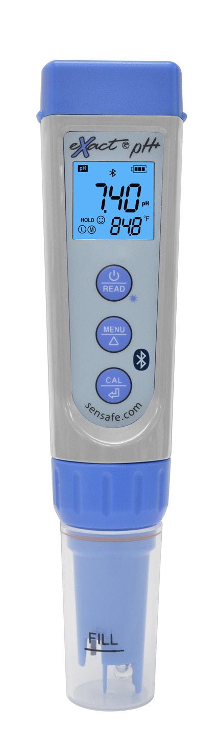 Our pH electrode consists of a pH glass/membrane and internal reference (combination pH electrode), which can generate a millivolt voltage potential. The pH glass bulb forms a hydrated layer in any water sample and responds to hydrogen ions (H+). As the Sodium ions (Na+) of the glass are displaced by hydrogen ions (H+), the mv potential change is measured by the eXact® pH+ Meter.