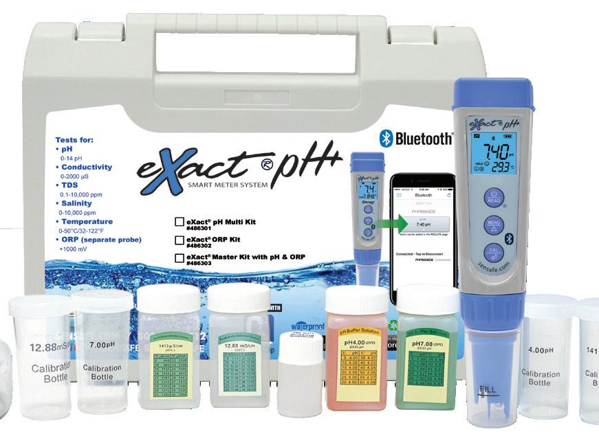 The eXact iDip® Pool Pro + Kit is the latest generation test kit that combines two state of the art water quality test instruments. The first is the revolutionary Level 1 NSF/ANSI-50 Certified eXact iDip® Smart Photometer System which integrates patented 2–way wireless communication with any compatible iOS or Android smart device and has the potential to test over 40 water parameters. The second is the eXact® pH+ Smart Meter system which capitalizes on electrochemistry technology combined with Bluetooth connectivity.