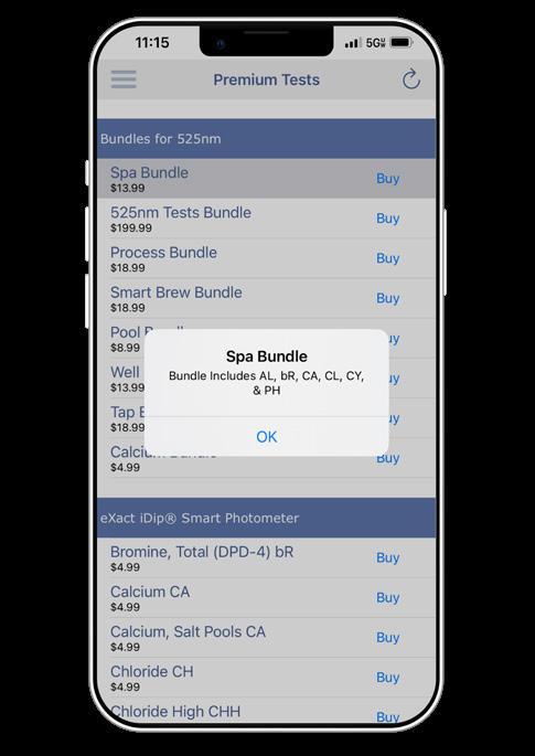 The eXact iDip® app comes pre-installed with tests for Total Alkalinity, Free Chlorine, Combined Chlorine, and pH. You can purchase and unlock over 50 additional tests (bundles available) from the Store located in the app (eXact® Strips/reagents not included).