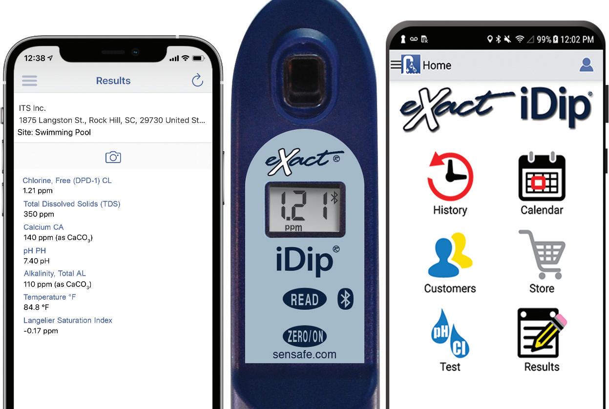 The eXact iDip® Pool Pro + Kit is the latest generation test kit that combines two state of the art water quality test instruments. The first is the revolutionary Level 1 NSF/ANSI-50 Certified eXact iDip® Smart Photometer System which integrates patented 2–way wireless communication with any compatible iOS or Android smart device and has the potential to test over 40 water parameters. The second is the eXact® pH+ Smart Meter system which capitalizes on electrochemistry technology combined with Bluetooth connectivity.