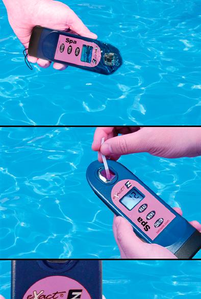 All tests with the Spa eXact® EZ use our patented eXact® Strips, a quick and easy reagent system for analysis. Simply dip an eXact® Strip Micro into the water sample for 10 seconds using a simple back and forth motion, discard the strip, and read the results instantaneously!
