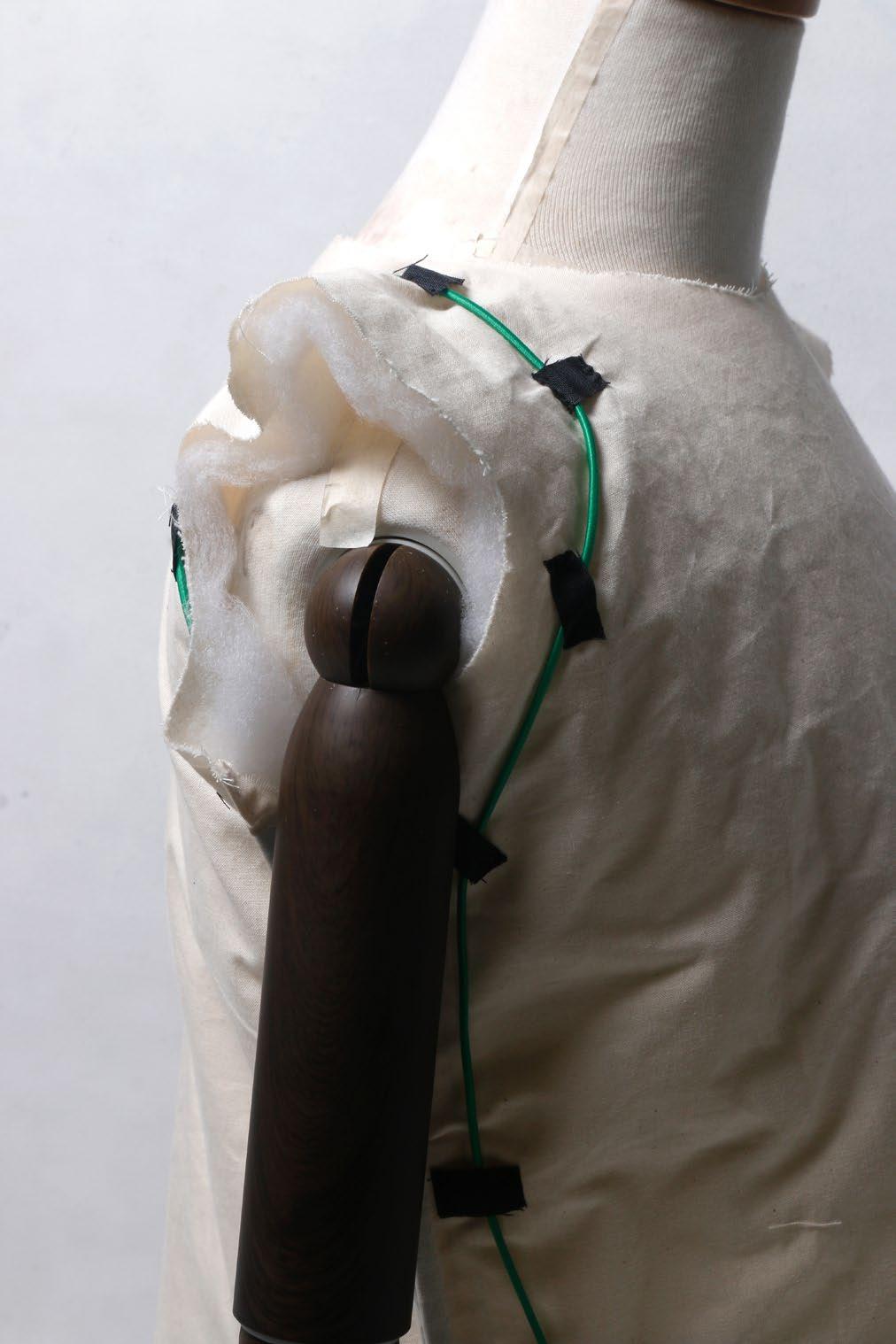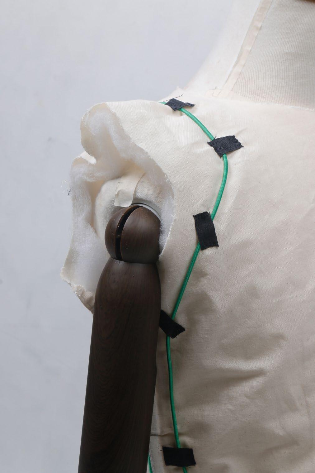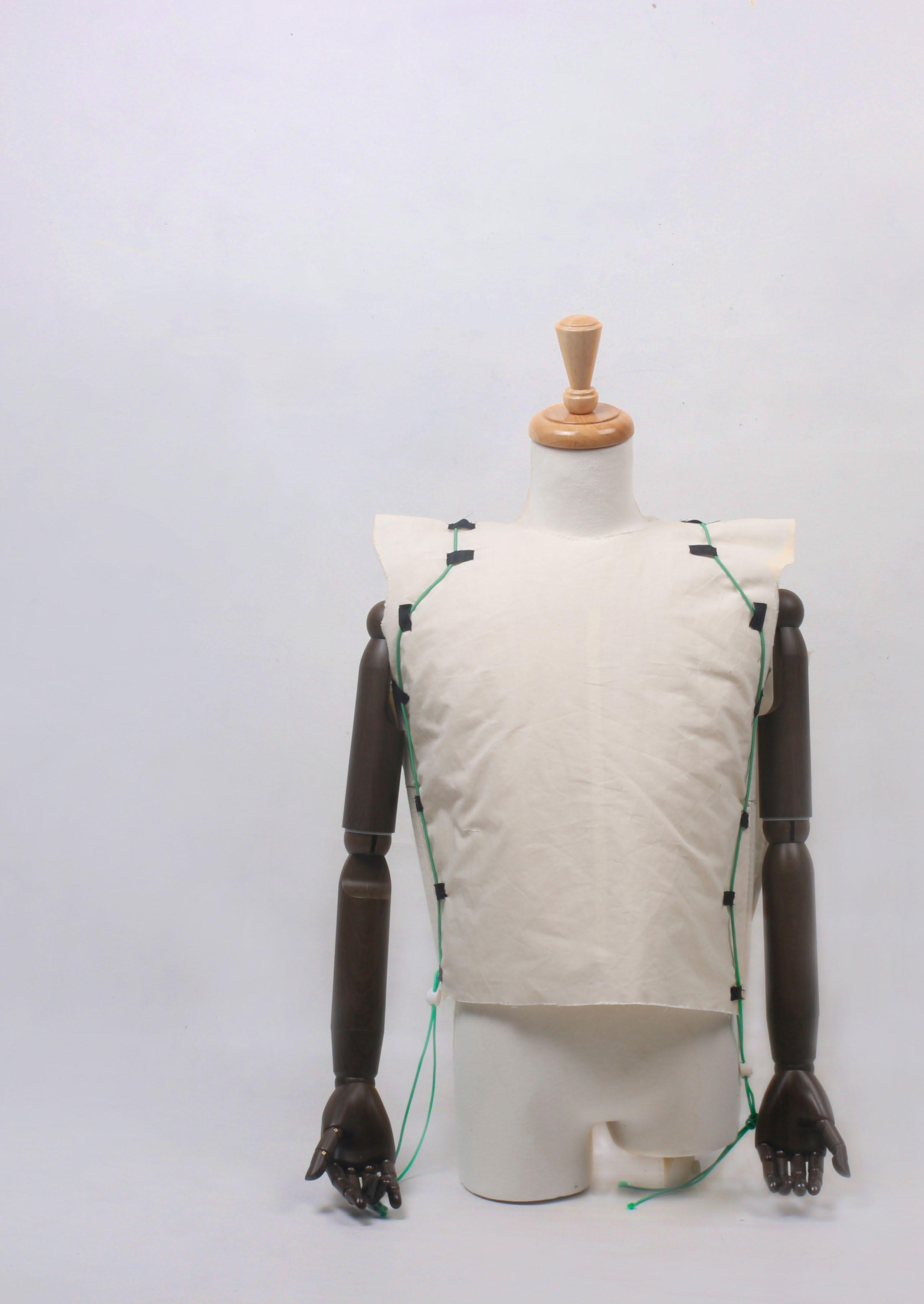 在製作草模的階段,我嘗試許多方法來使得衣物可以束緊在上半身。束扣是其中一 個當初的方案,優點在於可以簡單讓布料貼於人身上,不過因為在脫去時會讓年長 者不易操作而放棄了這個方向。