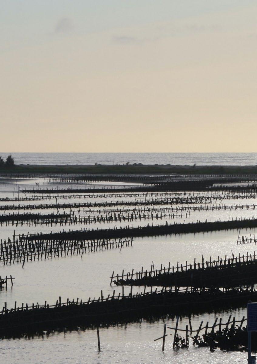 Oyster farming involves frequent transitions between rafts and racks, hindered by their height difference. 牡蠣養殖在整個階段需要多次的來回從竹筏到棚架再回來的這個過程,而不方便之處便在於需要跨過竹筏邊緣 和棚架的高度差。