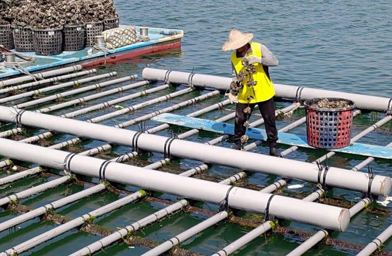 In western Taiwan, oyster farming involves suspended (“hanging racks”), horizontal (“inverted racks”), and floating rack styles. The first two select larger oyster shells as mother shells, drill holes, string them into “oyster strings” using ropes, then bind these strings vertically or horizontally onto oyster racks. The floating rack method fosters faster oyster growth by allowing racks to float long-term in the sea.