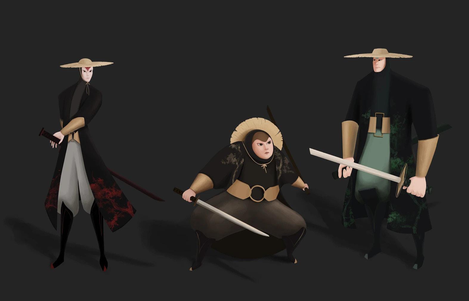biggest characters share a similar height, the shape application to their respective design is shown through the shapen of their body and also the shape of their clothes so they have a di silhouette. The Pandawa characters are primarily using the square and round shapes as their base, while the Kurawa primarily uses more triangular shape, mixed with square shape. The application of these shapes also symbolizes the characteristics of the faction, Pandawa is the reliable and strong faction, meanwhile Kurawa is overall a cunning and evil faction.