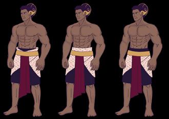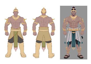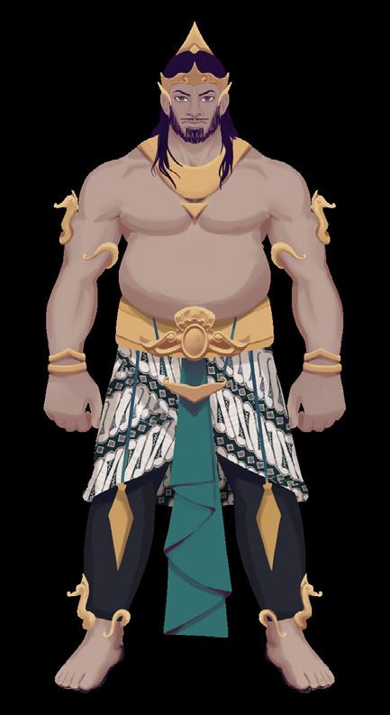 biggest characters share a similar height, the shape application to their respective design is shown through the shapen of their body and also the shape of their clothes so they have a di silhouette. The Pandawa characters are primarily using the square and round shapes as their base, while the Kurawa primarily uses more triangular shape, mixed with square shape. The application of these shapes also symbolizes the characteristics of the faction, Pandawa is the reliable and strong faction, meanwhile Kurawa is overall a cunning and evil faction.