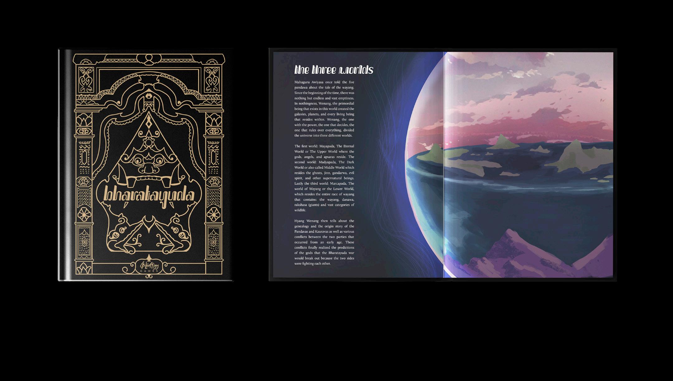 Bharatayuda is the title of my concept art final project. The overall theme of the prjoject is about the story of Wayang Mahabarata, based on N. Riantiarno’s book titled Mahabarata Jawa. The logotype design incorporates the handwritten aksara jawa, with the element of traditional wooden carving called ulir.