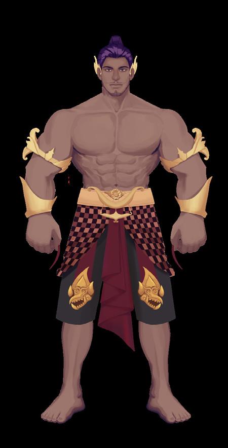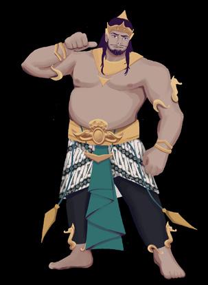 Durasana’s character design has a distinction shape and also the most dominant body shape where he has a large body and also a round stomach. This is based on the circular shape as the primary form of the Dursasana body. This is done by referring to the wayang kulit purwa from the character Dursasana. If you pay attention, the character Dursasana is not shown to have a navel. This is because he is part of a piece of meat that breaks into 100. However, Dursasana is the second oldest brother of the sata Kurawa because