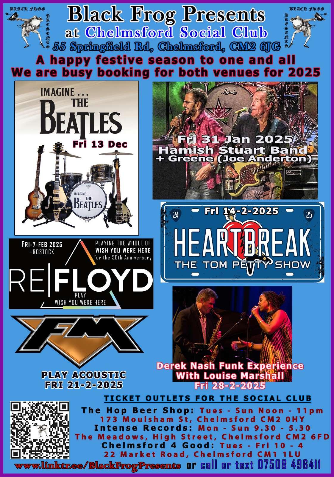 I have had to move one date for 2025 and that is for Broadway Clash; they will now play the Social Club on Friday 25th April. Other gigs booked so far for 2025 now include on Friday 28th February Derek Nash (Jools Holland) Funk Experience with Louise Marshall (Dave Gilmour and others), then Friday 27th June we have What a Waste