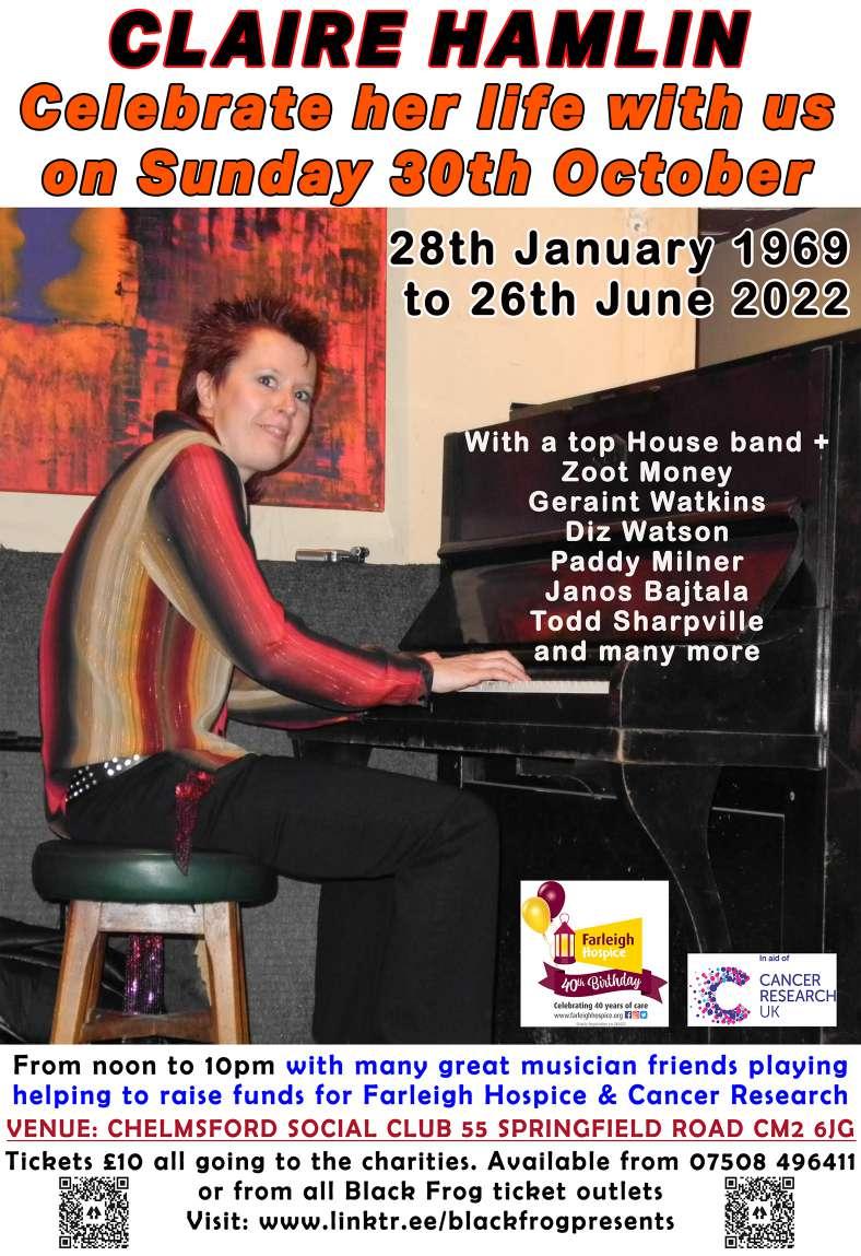 Black Frog Presents is back after a little break, during which I went to some festivals and I know all the others I work with have been busy as well. It has not stopped us booking and organising events during this time though. One of our main and most important events is on Sunday 30th October, when we will celebrate the life of our own Claire Hamlin who we lost in June (see the advert in this mag). Claire was widely regarded as one of the top boogie-woogie pianists. Playing on the day we have the likes of Zoot Money, Geraint Watkins, Diz Watson and many more. The event will also include her band mates from over the years, from The Alabama Slammers, The Alley Cats, The Kingsmen and more. Steve English, who played with Claire for many years, will be arranging the house band for us. Entry is just £10 with all money taken being split between Farleigh Hospice and Cancer Research. All of us working or playing on the day are giving our services for free. We plan to run the day from noon to 10pm, and we are planning for a lot people wanting to play. You will also be able to come and go as you wish throughout the day.