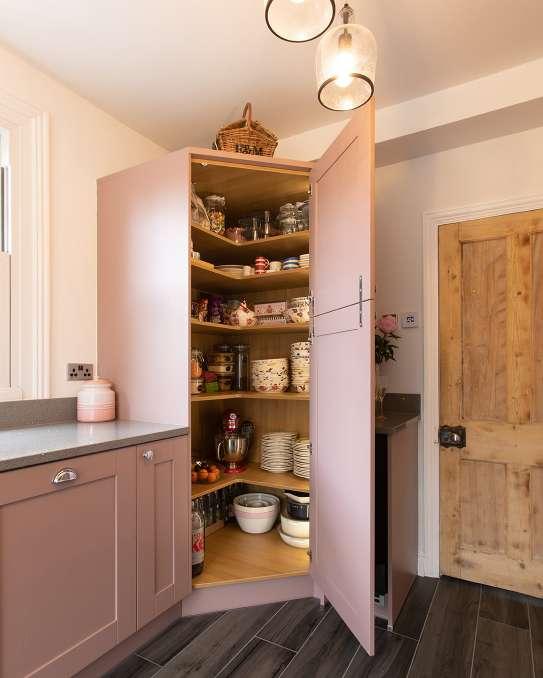 Top of Miss P’s wish list was a kettle tap which she is very pleased with, but she also owns a lot of kitchen and baking equipment, so it was important to find the right storage solutions to suit the design. Internal drawers, large larder cupboard as well as a corner larder and the open shelving, give her all the storage she needs.