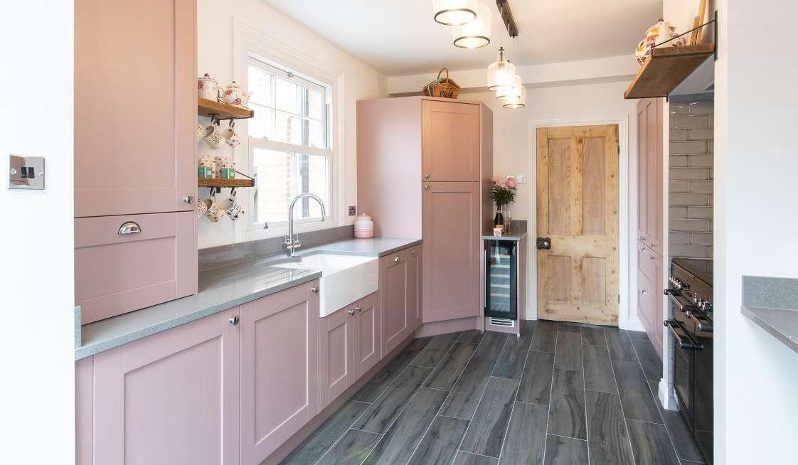 She was introduced to one of our designers, Stacey, who immediately grasped the brief and understood what Miss P wanted to achieve in the space. As her home is very traditional she wanted the kitchen to follow the same path, so she opted for a shaker-style door in Rose - this pink shade of door contrasts really well with the dark grey mirror sparkle quartz worktop and the Belfast sink completes the look she was hoping for.