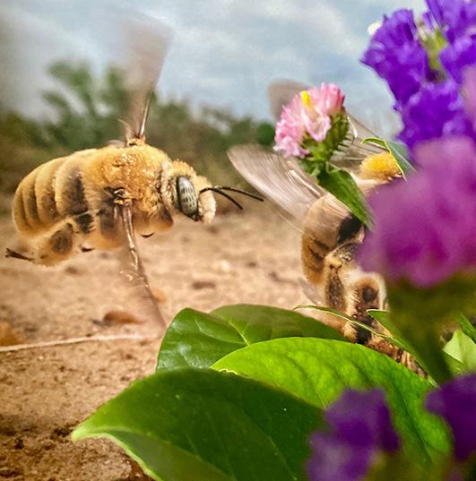 The results are two bees in focus while the flowers are not. One bee is out of focus and one flower is in focus. And one bee is flying into the frame from the side.