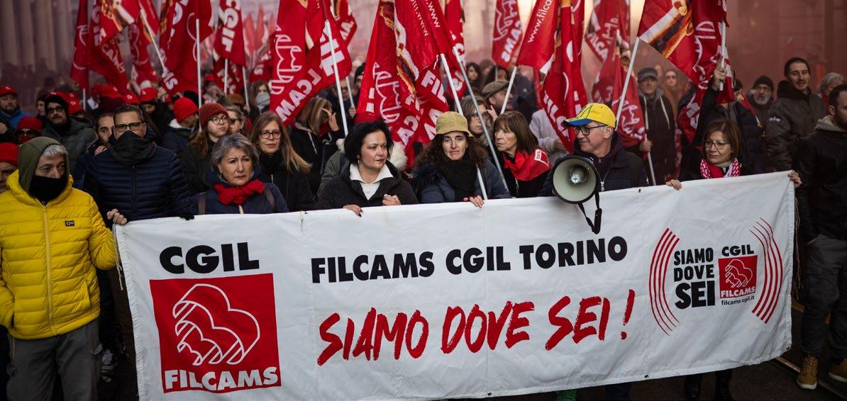 Manifestantes del sindicato CGIL FILCAMS protestan en Turín contra las restricciones a los derechos de huelga. La calificación de Italia empeoró de 1 en 2024 a 2 en 2025, lo que refleja una reducción de la protección de los trabajadores y las trabajadoras.