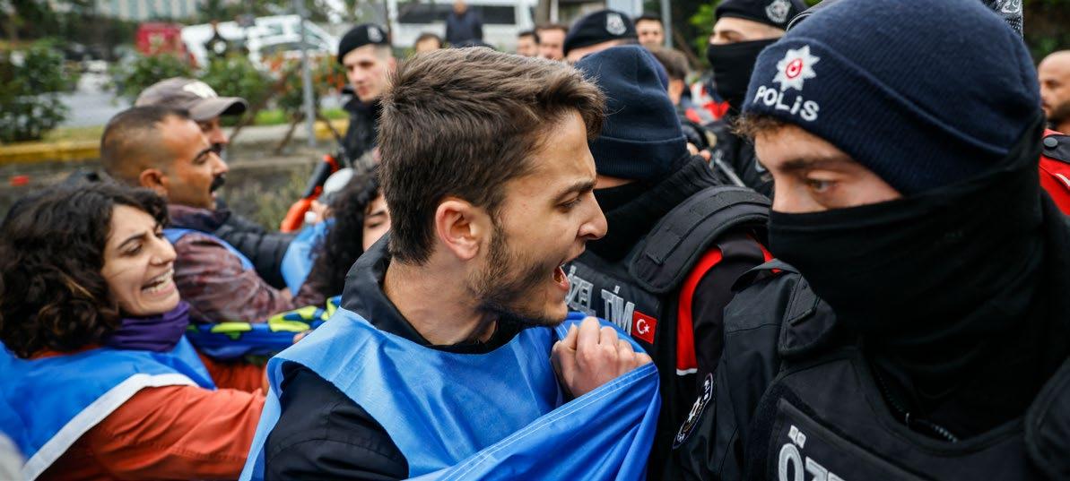 La policía turca detiene a una manifestante durante un mitin del Primero de Mayo de 2024 en Estambul, cuando los manifestantes trataban de dirigirse a la prohibida plaza Taksim. Decenas de personas fueron detenidas por toda la ciudad en medio de una fuerte represión por motivo del Día Internacional del Trabajo. Türkiye sigue figurando entre los 10 peores países del mundo para los trabajadores y las trabajadoras.
