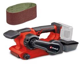 Familia Power X-Change, 18 V Motor sin escobillas. Electrónica de velocidad. Cambio de banda de lija sin herramientas. Superficie de apoyo integrada para el uso estacionario. Bloqueo de marcha permanente. Caja colectora de polvo. Incl. 3 bandas de lija (P80).