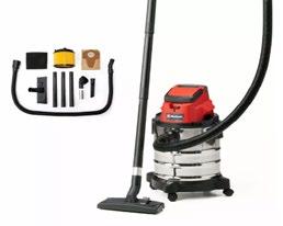 Familia PXC 18v. Depósito de acero inoxidable de 20 l. Conexión de soplado. 4 ruedas. Soporte de accesorios. Sistema de manguera con Ø 36mm. Incl. manguera de aspiración de plástico y tubo de prolongación de tres piezas, boquilla grande, para hendiduras y para tapicerías. Filtro de espuma, filtro de pliegues y bolsa de papel.