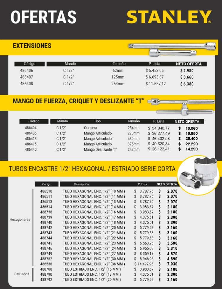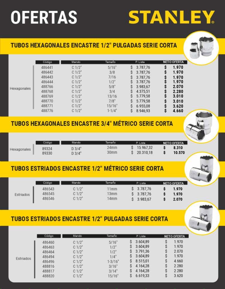 19 Tubos hexagonales encastre de 1/2'’ de las siguientes medidas en pulgadas: 1/4-5/16-3/8-7/16-1/2-9/16-5/8-11/16 y milimétricos de: 8-9-10-11-12-13-14-15-16-17-18mm.