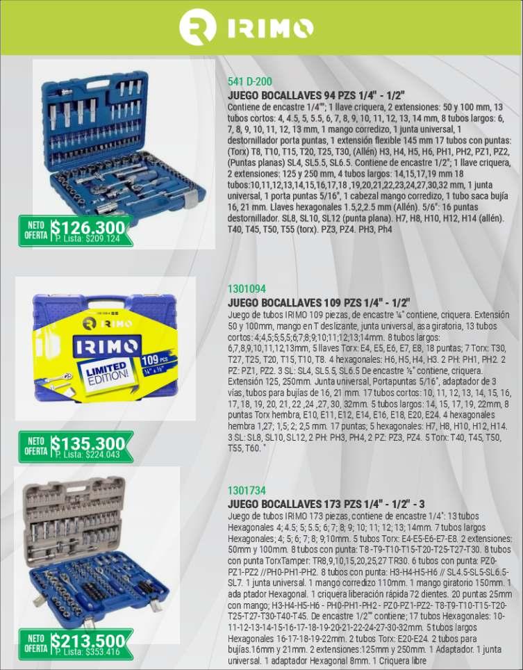 24 Tubos hexagonales encastre de 3/8'’ de las siguientes medidas en pulgadas: 1/4-5/16-3/8-7/16-1/2-9/16-11/163/4-13/16-7/8-15/16 y milimétricos de: 6-7-8-9-10-11-1213-14-15-18-19-20mm.