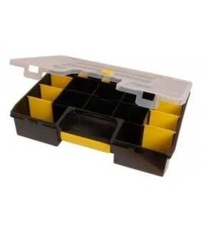 Caja de plástico con organizador transparente para almacenar piezas pequeñas. Cerradura de aluminio doble, mango de goma y bandeja interna extraíble con regla. Longitud: 558,8 mm. Ancho: 254 mm. Altura: 254 mm