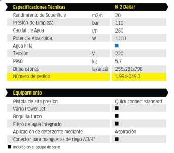 La nueva Hidrolavadora K2 Dakar posee pistola con Quick Connect y 4 m de manguera de alta presión. La lanza Vario Power (VPS) permite con un simple giro, regular la presión del agua. La boquilla turbo con chorro giratorio disuelve incluso la suciedad más resistente. La Hidrolavadora K2 Dakar es muy apropiada para la limpieza de autos, bicicletas, motos y equipos para el jardín.