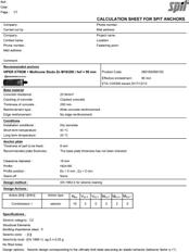 TENSILE NON-CRACKED CONCRETE ‒ C20/25 SIZE Ø5 Ø6 Ø8 hnom [mm] 20 25 30 NRd [kN] 0,30 0,45 0,60 Distances Scr and Ccr must be fulfilled NRd = NRk / γM γM = 2,0 ; γF = 1,4 SHEAR NON-CRACKED CONCRETE ‒ C20/25 SIZE 5X25/5 5X25/5 6X30/5 to 6X50/25 6X65/40 8X40/10 to 8X90/60 8X110/80 to 8X200/165 hnom [mm] 20 25 25 30 30 VRd [kN] 0,70 1,05 0,84 1,61 1,33 VRd = VRk / γM TENSILE MASONRIES SIZE Ø5 Ø6 Ø8 hnom [mm] 20 25 30 Solid concrete blocks B120 (fb = 13,5 N/mm²) NRd [kN] 0,15 0,20 0,25 Clay bricks (fb = 55 N/mm²) NRd [kN] 0,10 0,40 0,60 Hollow concrete blocks B40 not rendered (fb = 6,5 N/mm²) NRd [kN] 0,10 0,15 0,30 Hollow concrete blocks B40 rendered (fb = 6,5 N/mm²)* NRd [kN] 0,35 0,63 0,84 Hollow clay bricks Eco-30 not rendered (fb = 4,5 N/mm²) NRd [kN] 0,15 0,20 0,25 Hollow clay bricks Eco-30 rendered (fb = 4,5 N/mm²)* NRd [kN] 0,35 0,49 0,63 Engineering clay bricks not rendered (fb = 14,5 N/mm²)* NRd [kN] 0,21 0,28 0,35 Engineering clay bricks rendered (fb = 14,5 N/mm²)* NRd [kN] 0,35 0,49 0,63 Aerated concrete (Mvn = 500 kg/m3)* NRd [kN] 0,06 0,08 0,12 Plasterboard BA13* NRd [kN] 0,06 0,06 0,07 Plasterboard BA10 + polystyrene* NRd [kN] 0,07 0,07 0,08 Distances Scr and Ccr must be fulfilled NRd = NRk / γM γM = 2,0 * Base materials not submitted to ETA