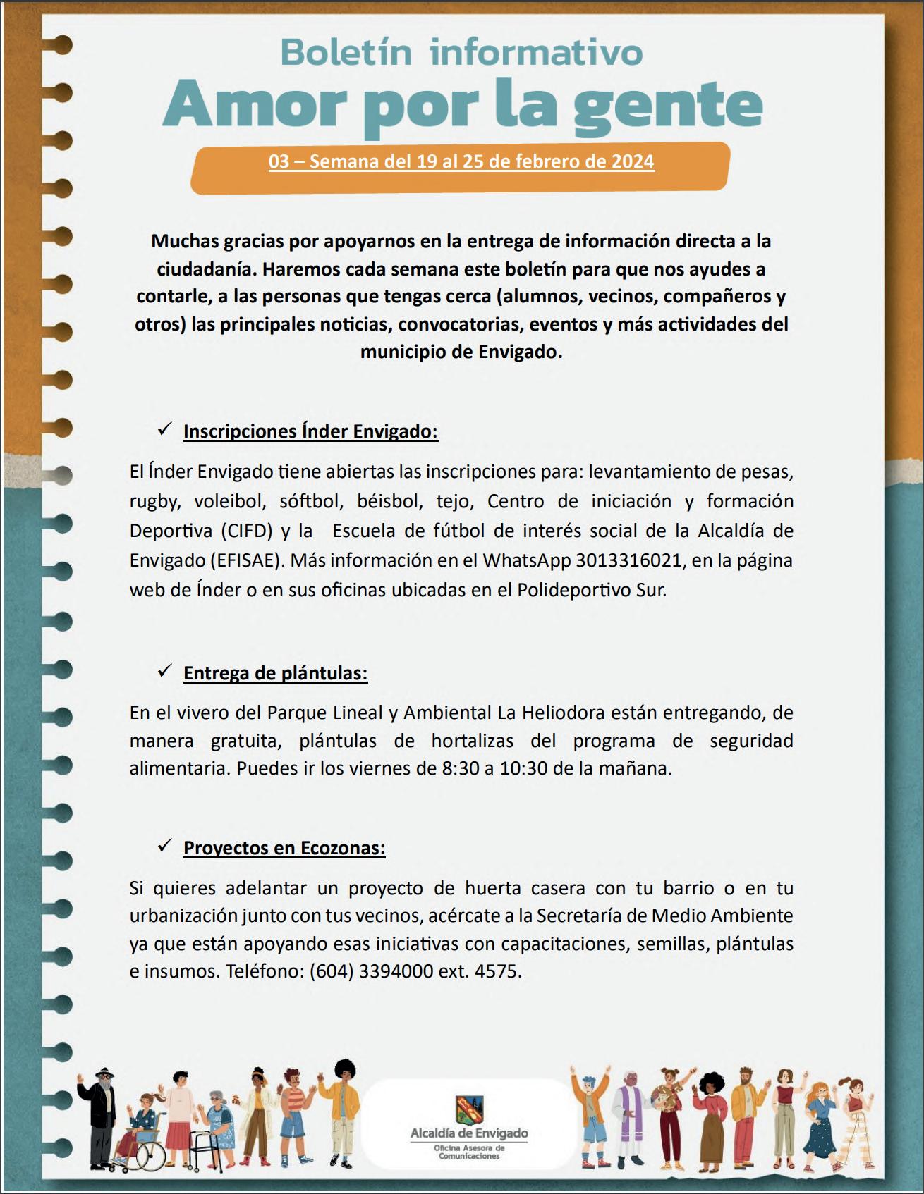 Haz clic y conoce el boletín informativo de la Alcaldía Municipal. Podrás acceder a las principales noticias, convocatorias, eventos y más actividades que se realizarán en el Municipio de Envigado, durante la semana del 22 al 28 de