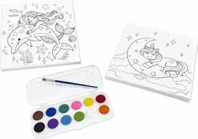 płótno na drewnianej ramie; wymiary: 25 × 25 cm; wstępnie zadrukowane; w zestawie plastikowe pudełko na farby z 12 akwarelami i pędzelek
